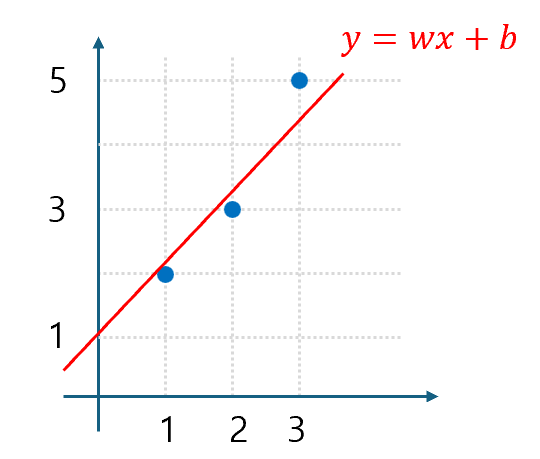 이 세 점을 동시에 완벽하게 관통하는 하나의 직선은 존재하지 않습니다. 따라서 우리의 목표는 이 점들과 가장 오차가 적은(가장 근접하게 지나가는) 직선인 $y = wx + b$를 찾는 것입니다. (여기서 $w$는 기울기, $b$는 y절편을 의미합니다.)