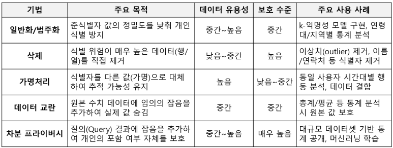 정리하자면, 특정 기법 하나에 의존하기보다는 데이터와 분석 목적에 맞춰 다양한 기법을 조합하고, k-익명성과 같은 프라이버시 모델을 통해 안전성을 지속적으로 검증하는 종합적인 접근 방식이 필수적입니다.