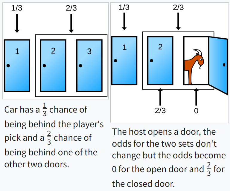 세 개의 문이 있고 한 개의 문 뒤에는 자동차, 나머지 두 개의 문 뒤에는 염소가 있습니다. 각각의 문에는 1, 2, 3으로 번호가 붙어 있고 문이 닫힌 상태에서는 뒤에 무엇이 있는지 알 수 없습니다. 게임쇼 참여자가 1번을 선택하였습니다. 이어서 문 뒤에 무엇이 있는지 알고 있는 진행자는 3번 문을 열었고 그 뒤에는 염소가 있었습니다. 게임쇼 참여자에게 선택을 2번으로 바꿀 수 있는 기회가 주어집니다. 그렇다면 1번에 머무르는 것보다 2번으로 바꾸는 것이 우승할 확률을 더 높여줄까요?
